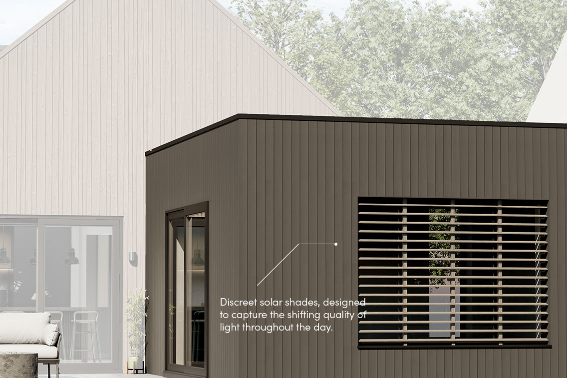 At its core is a large picture window fitted with discreet solar shades, designed to capture the shifting quality of light throughout the day while ensuring comfort and control. Parapet walls emphasise the clean geometry of the form, giving the extension a quiet presence that feels both elegant and timeless.